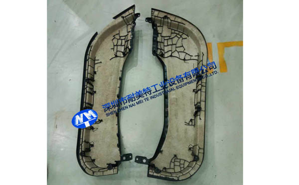 2.零件停留在熱烤箱里大概5分鐘,加熱到200±3℃,然后向注塑設備的機器人發出請求,機械人利用爪具移走兩個零件(左右各一)并且送到注塑設備里。